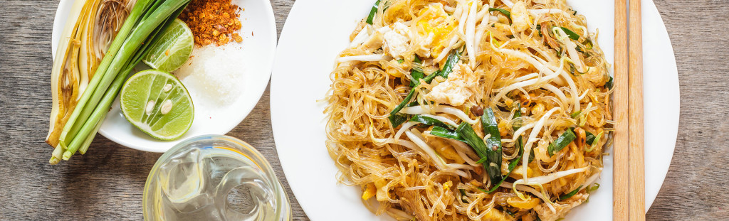 Stir-fried rice noodles with Pad Thai sauce prawns egg, chive topping w dried shrimps| carrots tofu fresh bean sprout, crushed peanut
